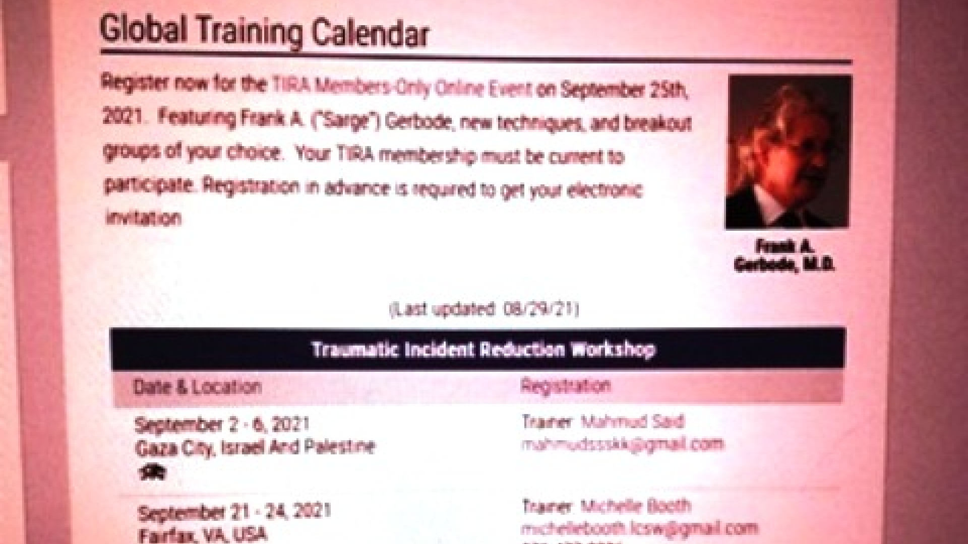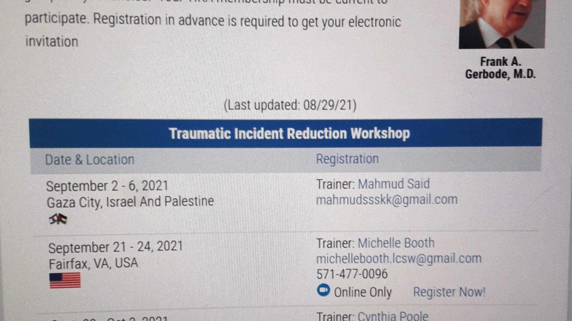 Traumatic Incident Reduction Workshop-TIRW - Level 1 - Anxiety and PTSD – Therapy دورة تدريبية بعلاج " الرهاب واضطراب ضغط ما بعد الصدمة في مدينة غزة 02-09-2021 – (لمشاهدة الاعلان عن الدورة في موقع المدرسة أنظر في روابط). المدربين: د. محمود سعيد, د. جمال دقدوقي