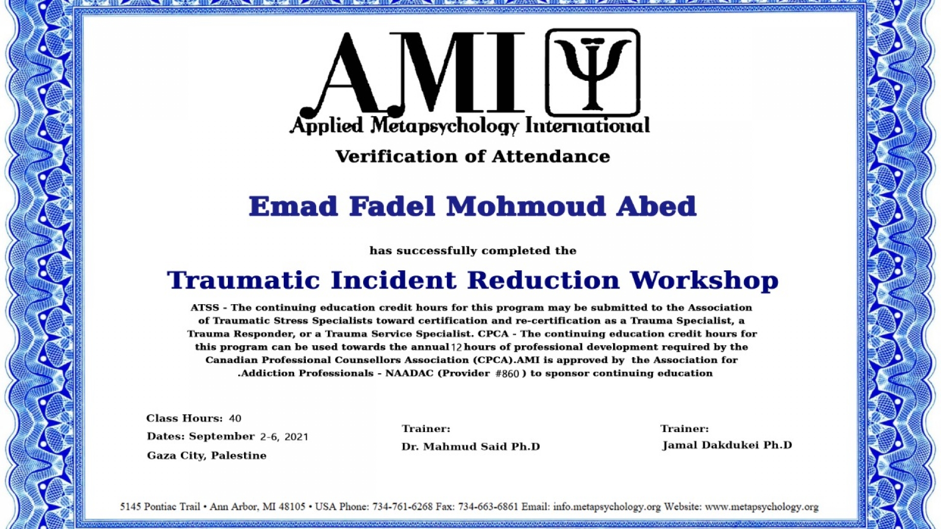دورات تدريبية لعلاج الصدمة - د. محمود سعيد - Traumatic Incident Reduction –Trainer, Dr. Mahmud said